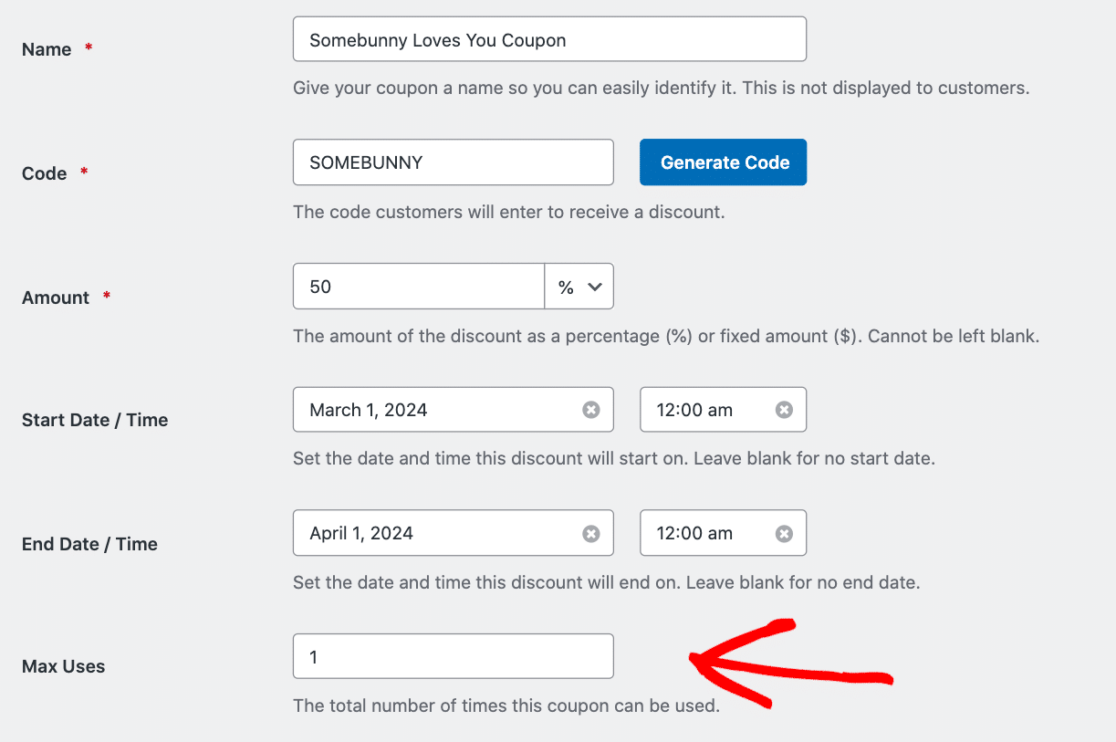 Ora, per un altro coupon (puoi crearne quanti ne vuoi), utilizzerò il campo Usi massimi perché offrirò un grande sconto.