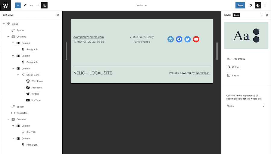 Nel caso del contenuto dei widget o di qualsiasi altro contenuto personalizzato che non rientri in un plugin compatibile con FSE, non hai altra scelta che ricrearlo direttamente nel template o parte del template che ti interessa. Ad esempio, il footer del tema TT1 mostra le informazioni per contattarti e visitare i tuoi social, organizzate in tre colonne: