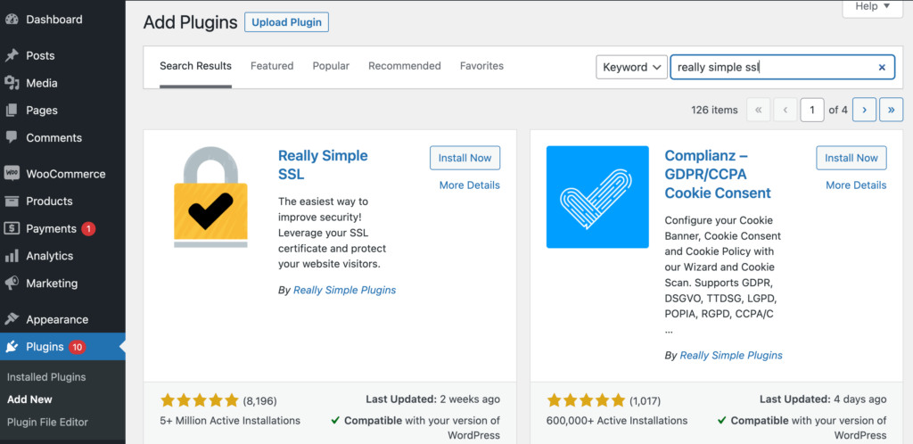 Questo plugin gratuito utilizza un certificato TLS gratuito fornito da Let's Encrypt. Per installarlo, vai semplicemente alla dashboard di WordPress e vai su Plugin > Aggiungi nuovo . Quindi, cerca Really Simple SSL: