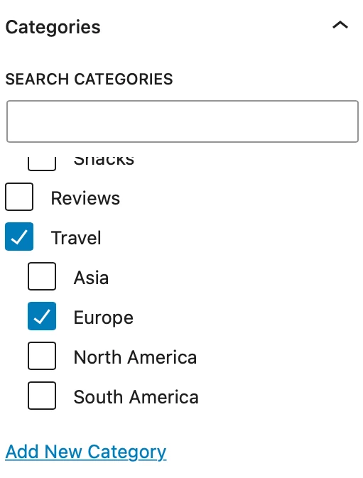 Come abbiamo accennato, puoi anche creare categorie secondarie (o sottocategorie) per aggiungere più struttura al tuo sito. Pertanto, se gestisci un blog di viaggi, potresti archiviare i tuoi post in categorie basate sulle destinazioni.