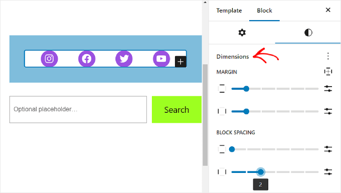 Scorrendo verso il basso la stessa scheda, troverai le impostazioni Dimensioni per personalizzare il margine e la spaziatura del blocco.