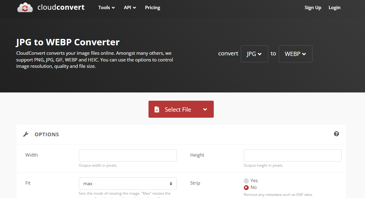 Qui utilizzeremo Cloud Convert . Lo strumento è così facile da usare e viene fornito con opzioni di configurazione minime. La prima cosa che devi fare è andare al convertitore da JPG a WebP di Cloud Convert.