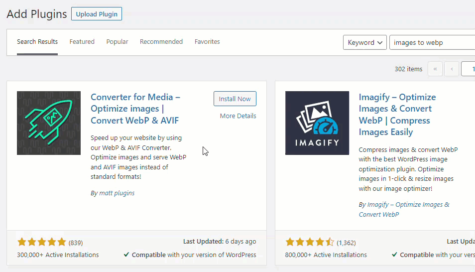 Se hai bisogno di un metodo semplice, continua a leggere questa sezione. Sono disponibili diversi plugin per la conversione da JPG a WebP. Per questo tutorial utilizzeremo il plugin Converter for Media. La prima cosa che devi fare è installare e attivare il plugin sul tuo sito web.