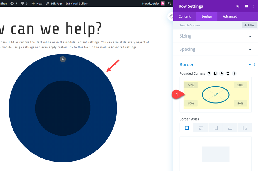 Dobbiamo impostare sia l'altezza che la larghezza della riga su 500 px in modo che sia un quadrato perfetto. Questo ci permetterà di dargli una forma circolare perfetta usando l'opzione angoli arrotondati (raggio del bordo) in Divi.