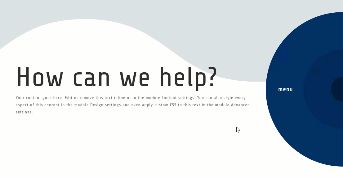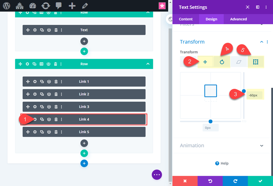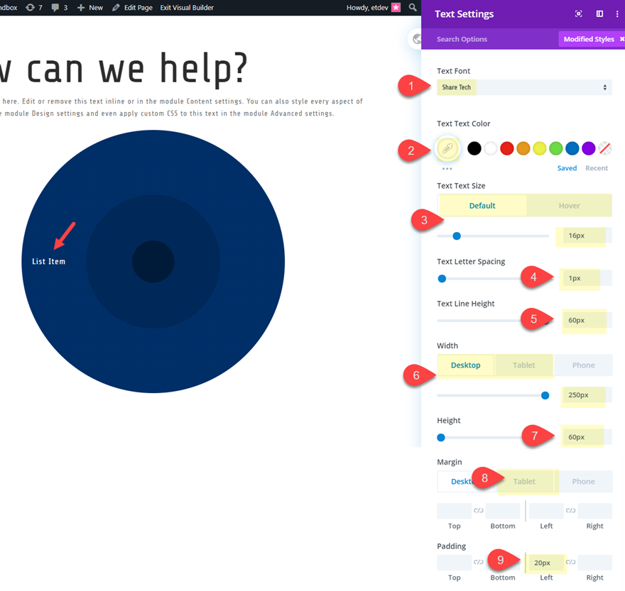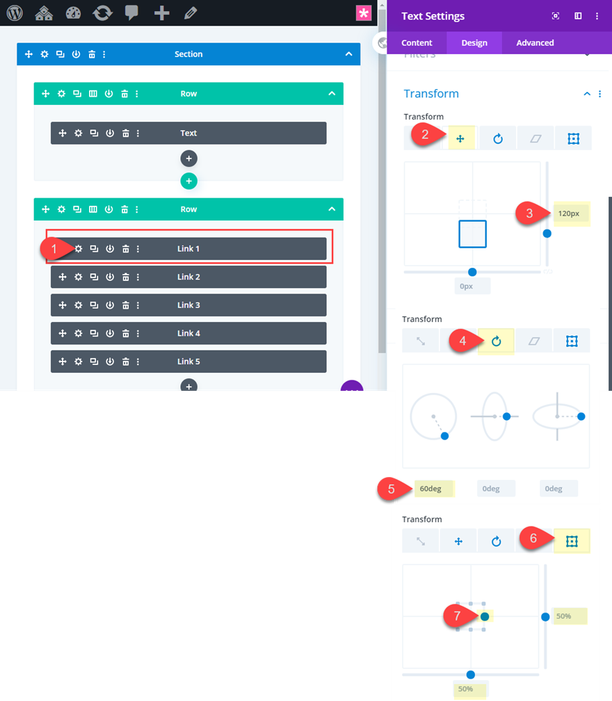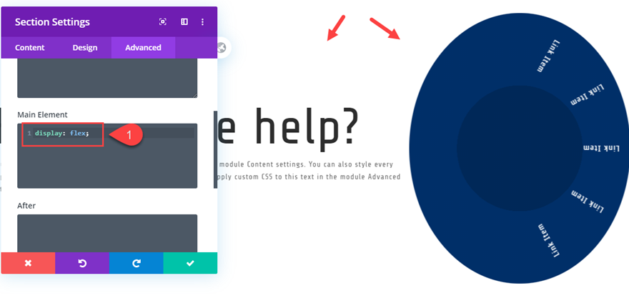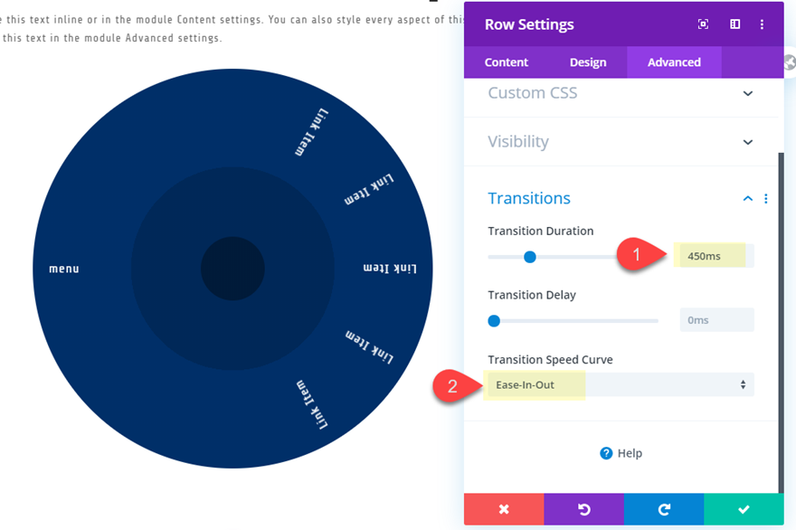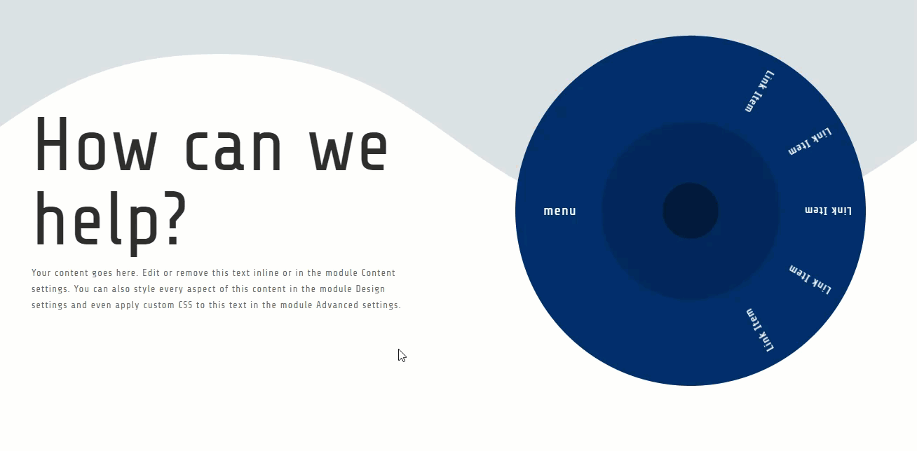 La ruota viene creata trasformando una riga in un elemento circolare assegnandole un'altezza e una larghezza di 500 px e angoli arrotondati del 50%. Ogni collegamento al menu viene creato in un modulo di testo separato e viene allineato lungo il perimetro della riga circolare ruotando ciascun modulo di testo lungo il raggio (centro) della riga. Questa configurazione è simile a come creeresti un testo curvo in Divi.