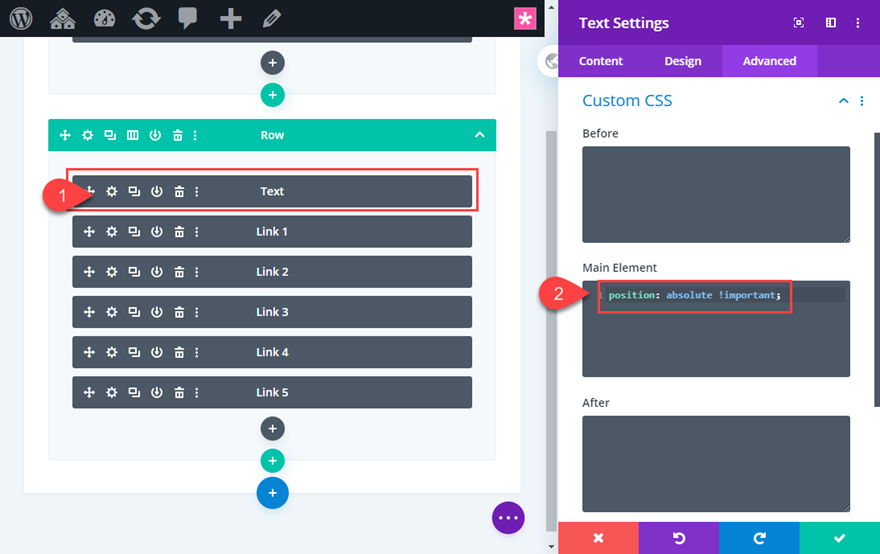 Una volta fatto, dobbiamo dare al modulo di testo dell'etichetta del menu una posizione assoluta. Per fare ciò, aggiungi il seguente CSS personalizzato all'elemento principale: