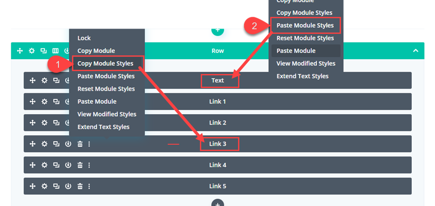 Quindi, per accelerare il design, copia gli stili dei moduli del modulo di testo per Link 3 e incolla quegli stili del modulo nel nuovo modulo di testo.