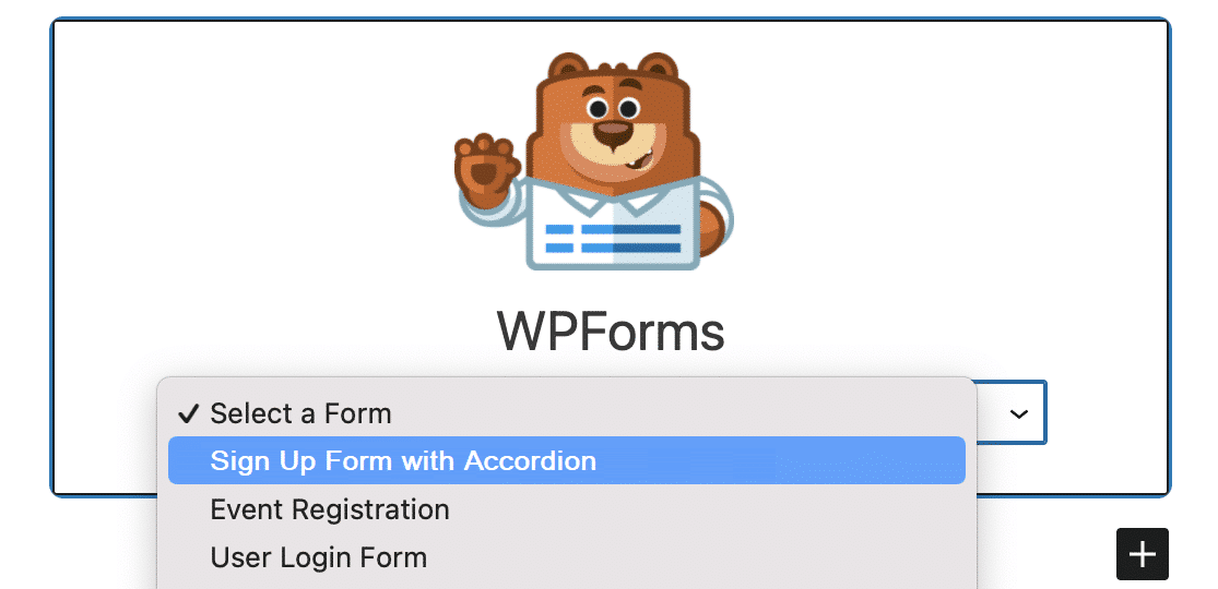 Successivamente, scegli il design del modulo a fisarmonica dal menu a discesa nel blocco WPForms per aggiungerlo alla tua pagina o al tuo post.