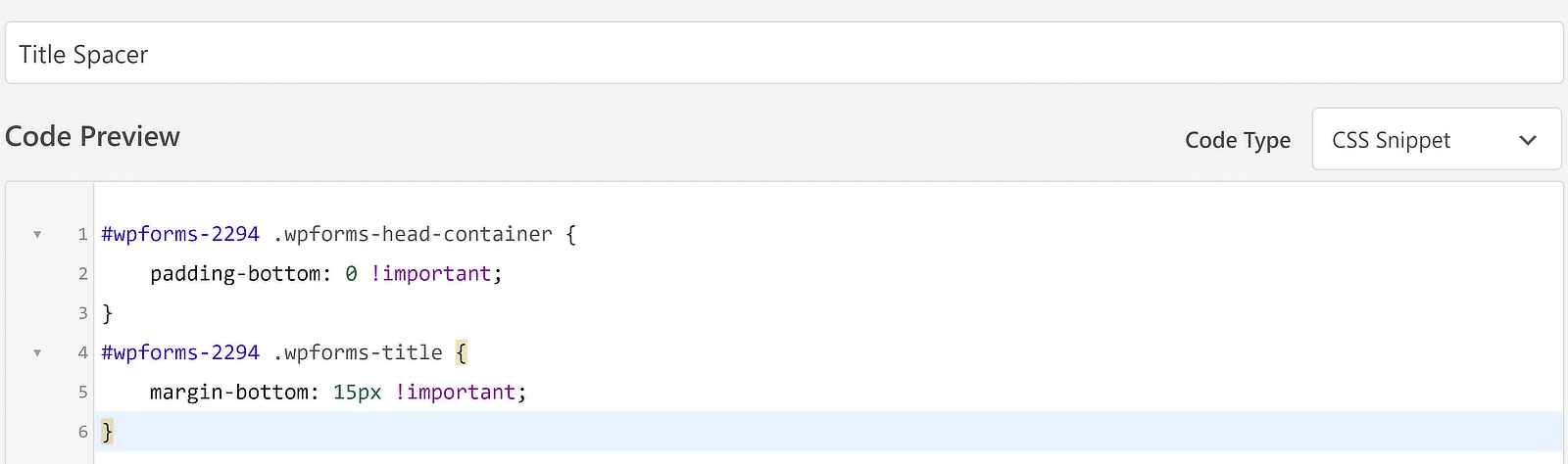 Poiché tutti i codici per il controllo della spaziatura in un modulo sono CSS, assicurati di selezionare Snippet CSS nel menu a discesa Tipo di codice.