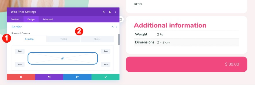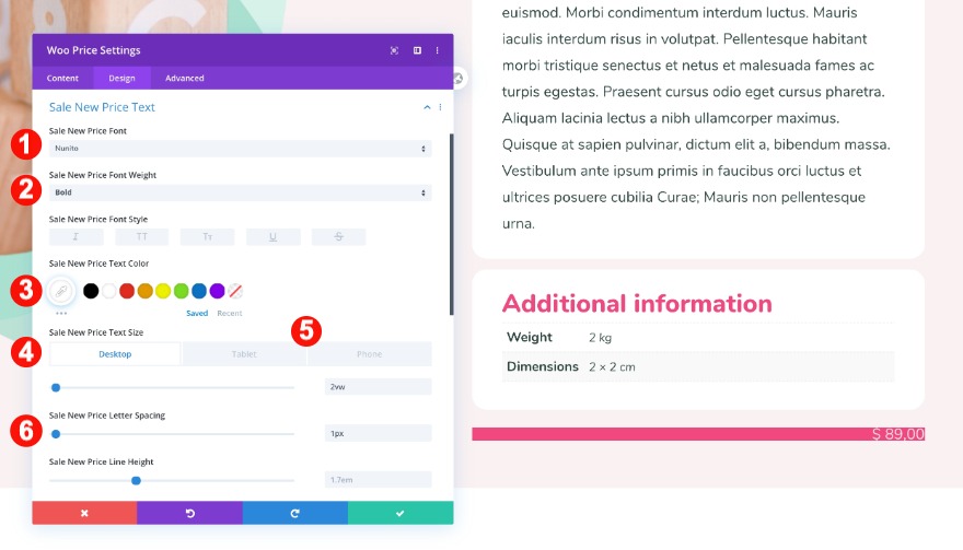 * Quando aggiungi un nuovo e un vecchio prezzo di vendita a un prodotto, il modulo del prezzo di woo non li mostrerà entrambi nel generatore di temi. Controlla sulla pagina del prodotto reale per vedere come appare il design finale.