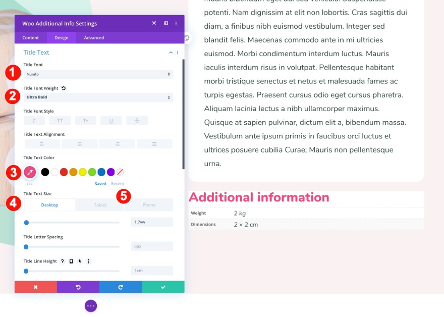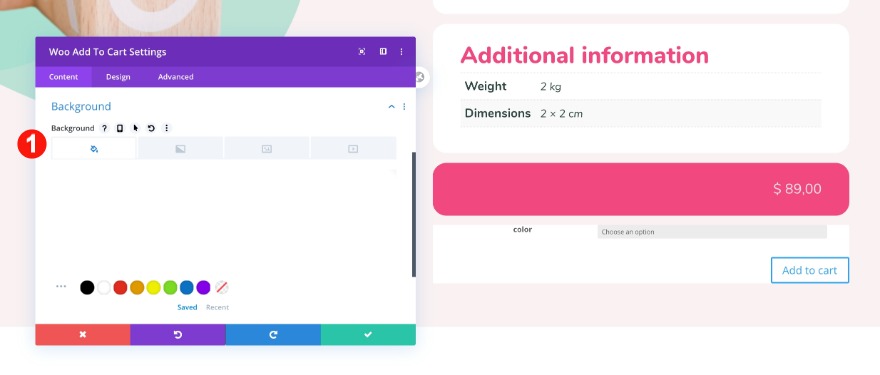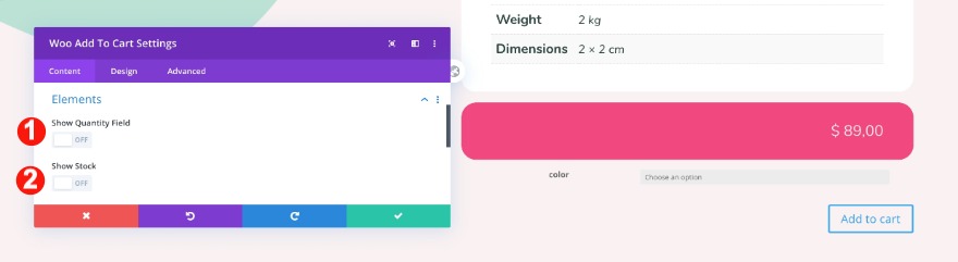 * Quando aggiungi un modulo woo add to cart, noterai che nella parte superiore ha un menu a discesa per un'opzione di colore. Se non l'hai specificato nella pagina del prodotto, non verrà visualizzato nel design finale. Puoi assicurarti controllando il prodotto live mentre stai costruendo all'interno del generatore di temi.