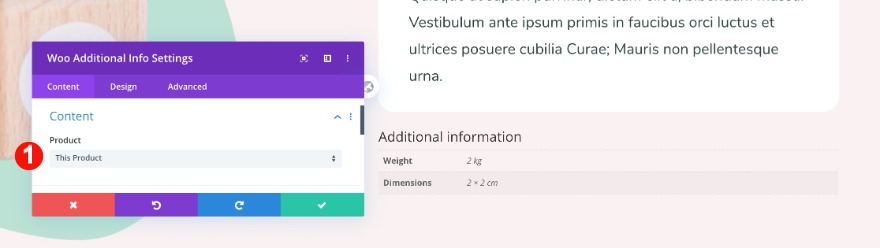 Sotto il modulo di descrizione, aggiungi il modulo di informazioni aggiuntive woo. Scegli questo prodotto nella scheda contenuto.