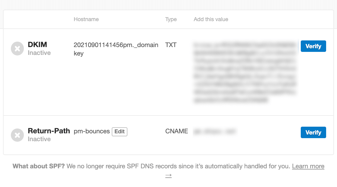 Dopo aver aggiunto i record DNS al tuo host web, torna alla pagina di verifica DNS del dominio di Postmark e fai clic sui pulsanti Verifica accanto a ciascun record.