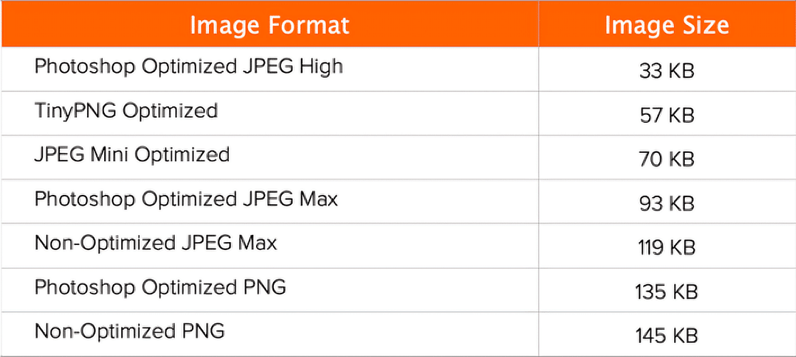 Tuttavia, in base al formato immagine e al metodo di compressione utilizzato, è possibile ridurre le dimensioni dell'immagine fino a 5 volte. Per aiutarti a selezionare lo strumento giusto, dai un'occhiata a questa tabella comparativa delle dimensioni dei file per diversi strumenti di compressione: