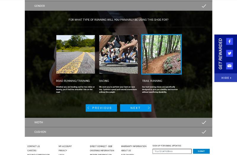 Puoi raggiungere questo obiettivo con gli assistenti digitali, come possiamo vedere da Mizuno, dove il loro selezionatore di scarpe può aiutarti a scegliere le scarpe da corsa giuste per le tue esigenze.