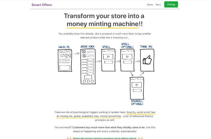 Utilizzando uno strumento come Smart Offers puoi ottenere un risultato simile. Invece di ingombrare il tuo check-out con cose che potrebbero distrarre i tuoi utenti, Smart Offers consente loro di effettuare il check-out e quindi mostra loro altre offerte a cui potrebbero essere interessati. Possono aggiungerle al loro ordine anche dopo averlo fatto senza dover effettuare nuovamente il check-out .