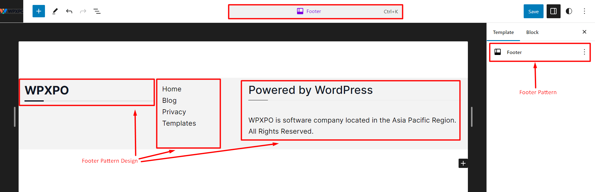- Aggiungi la parte del modello del piè di pagina allo stesso modo.