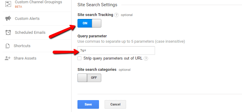 Se stai utilizzando Google Analytics, devi prima abilitare il monitoraggio della ricerca su sito andando su Amministratore → Visualizza → Visualizza impostazioni. Scorri fino in fondo e attiva Monitoraggio ricerca sito . Assicurati di aggiungere il parametro di query per la funzione di ricerca della tua knowledge base (ad es. "?s="):