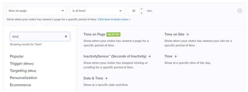 Ad esempio, puoi visualizzare i popup quando qualcuno trascorre una certa quantità di tempo sulla tua pagina o sito web. Puoi anche visualizzare le campagne in un giorno, un'ora o un mese specifici. Puoi anche personalizzare le tue campagne per diversi segmenti di pubblico.