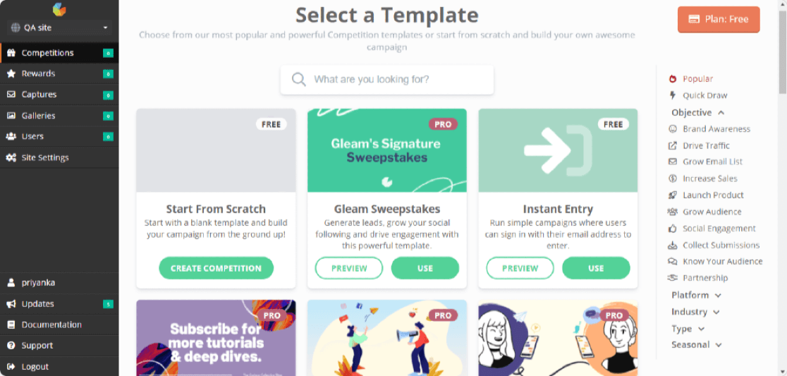 Una volta terminato il processo di registrazione, puoi andare alla dashboard di Gleam per creare il tuo omaggio.