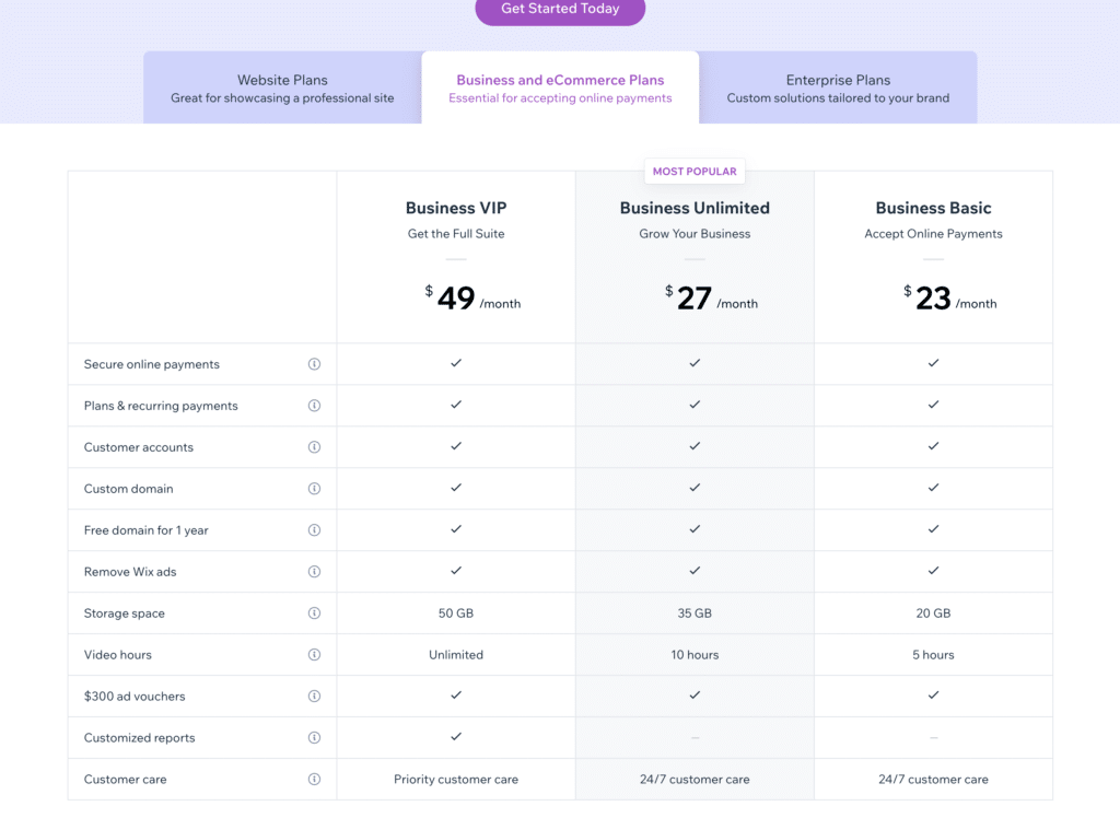 Per l'e-commerce, Wix offre tre piani: Business VIP ($ 49 al mese), Business Unlimited ($ 27 al mese) e Business Basic ($ 23 al mese).