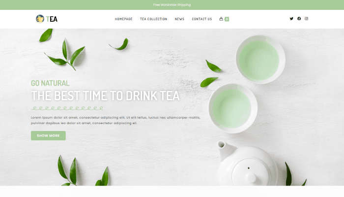 Il tema Tea Shop è un modello versatile e facile da usare progettato specificamente per i negozi di tè. Offre una gamma di opzioni di personalizzazione per personalizzare l'aspetto del tuo sito web in base al tuo marchio.