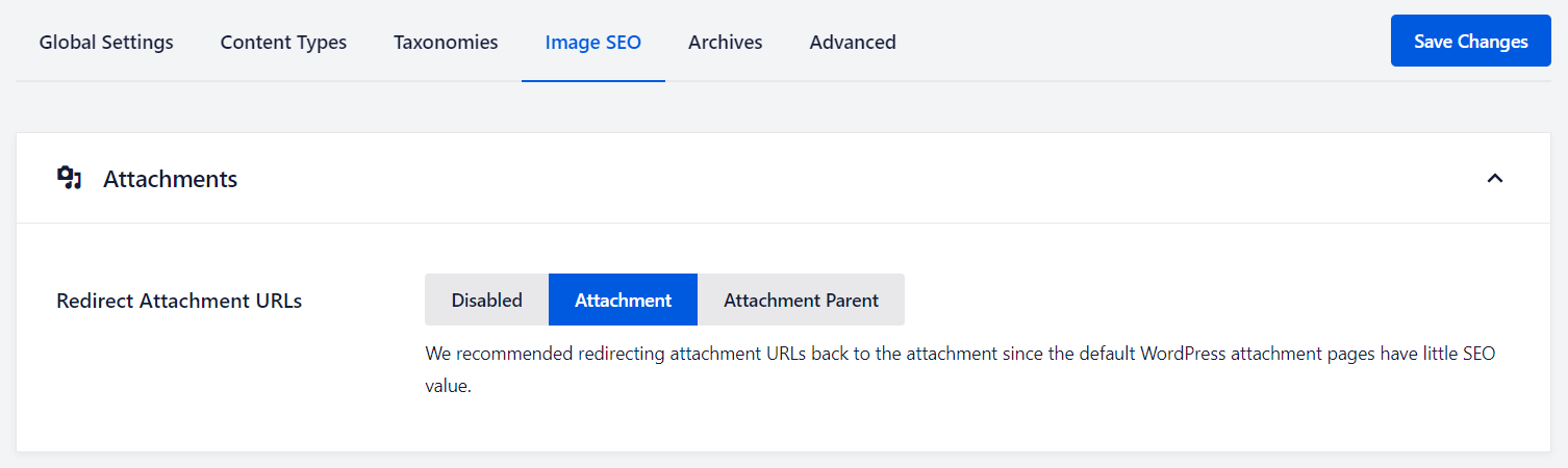 2. Nella sezione Reindirizzamento URL allegati verranno visualizzate tre opzioni. Qui puoi disabilitare completamente la pagina degli allegati scegliendo l'opzione Disabilitato . Oppure, decidi se l'URL rimanda all'allegato o alla pagina principale dell'allegato .