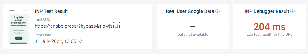 Per misurare il miglioramento delle prestazioni INP, ti consigliamo di utilizzare uno strumento come INP Debugger di DebugBear, che ti fornirà un quadro chiaro della reattività del tuo sito prima e dopo aver abilitato WP Rocket 3.17 e la sua funzione automatica Lazy Rendering.