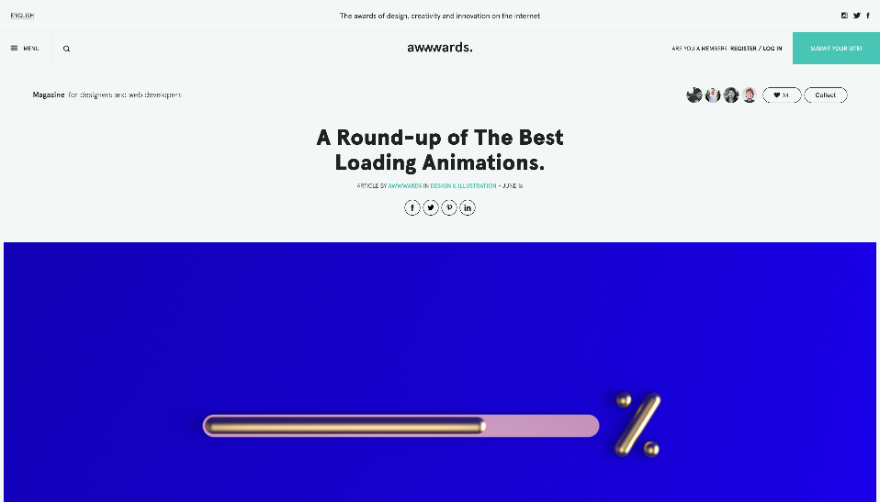 独自の読み込みアニメーションを作成したり、カスタマイズオプション付きのプラグインを使用したりする機会がある場合は、プリローダーがブランド化されていることを確認してください。 これは、ブランドのWebサイトの色を使用して、実際に会社のイラストを使用するのと同じくらい簡単です。 読み込みアニメーションのブランド化の背後にある考え方は、それがそのサイトに属しているように見え、単なるアドオンではないということです。 Awwwards Webサイトでのこのまとめは、あなた自身の作品に刺激を与えることができます。