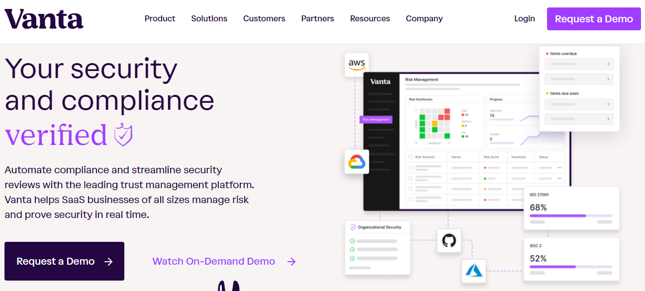 Vanta は、SOC 2、ISO 27001、HIPAA など、最も需要の高いセキュリティとプライバシーのフレームワークを提供することで、企業が成長を加速し、効率的なコンプライアンス プロセスを構築し、ビジネスのリスクを軽減し、外部のステークホルダーとの信頼。