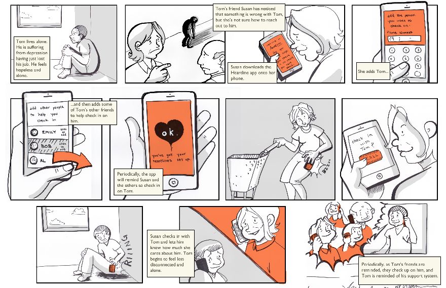 チェルシーのストーリーボードが最初から最後まで完全なストーリーをどのように描いているかに注目してください。 スーザンによるハートラインアプリの使用だけに焦点を当てているわけではありません。 それは実際の状況で始まり、アプリを使用してトムと接続するスーザンでピークに達し、問題の実際の解決で終わります。