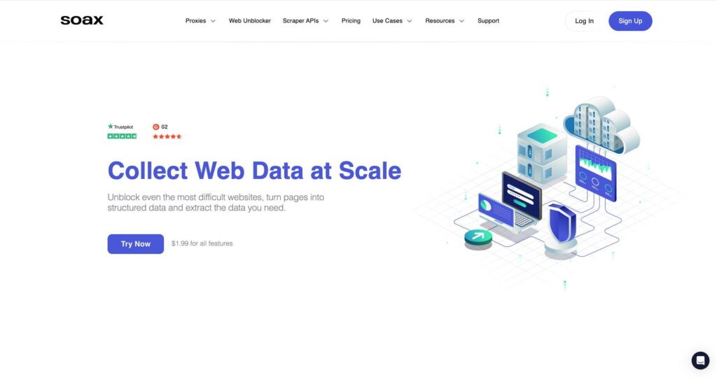 Soax は、倫理的に調達された 1 億 9,100 万台を超える信頼性の高いプロキシ サーバーを使用し、99.55% の成功率と0.55 秒未満の応答時間を保証します。 このプラットフォームはプライバシー規制に準拠しており、データ収集、ソーシャルメディア追跡、価格比較、SEO監視などのさまざまなユースケースに対応したソリューションを提供します。