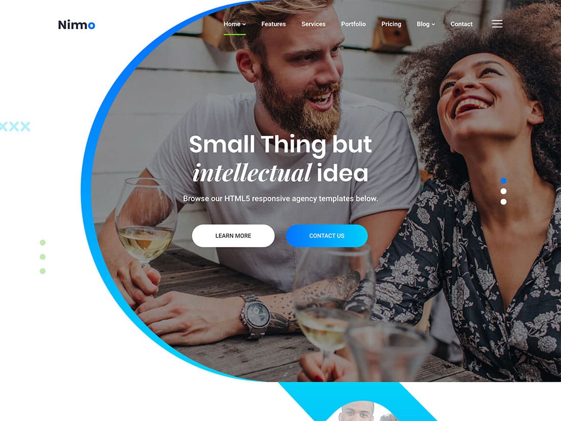 Nimmoは、フラットなユーザーインターフェイスを備えた1ページのクリエイティブエージェンシーWordPressテーマです。