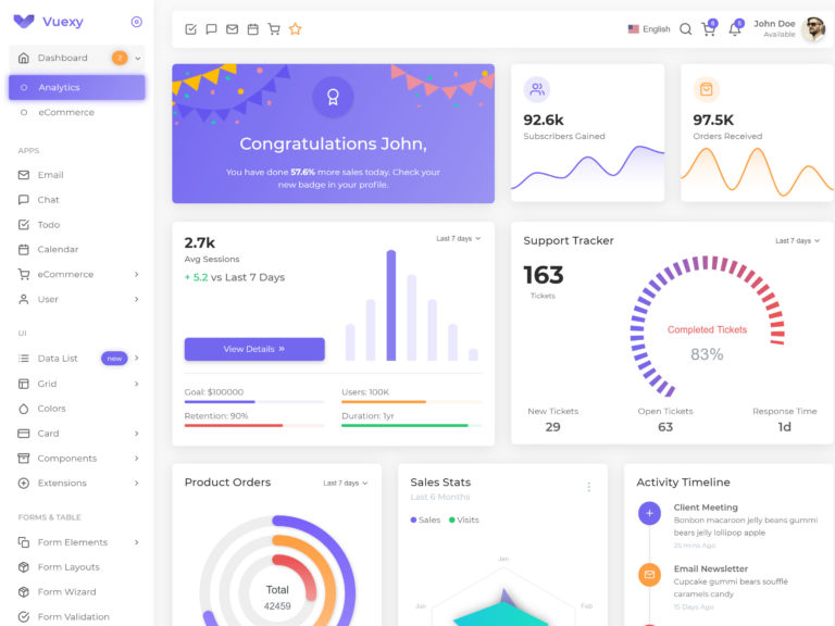 Vuexy HTMLおよびLaravelパッケージを構成するデモには、ダッシュボードの外観に関する多くのオプションがあります。 これらはすべてカスタマイズして、プロジェクトに固有のソリューションを構築できるようにすることができます。 ただし、完全に形成されてすぐに使用できるテンプレートのセットを探している場合は、Vuexyもその基準を満たしています。