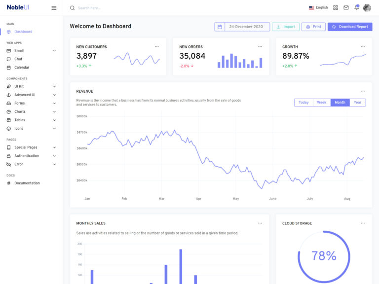 NobleUIで構築されたデモダッシュボードは、この管理テンプレートパッケージを選択した場合に管理領域がどのように見えるかを明確に示します。 ほとんどのシナリオをカバーするために、NobleUIデモは、ライトモードとダークモード、垂直オプションと水平オプション、RTL対応のレイアウトなど、いくつかの異なる構成で提供されます。