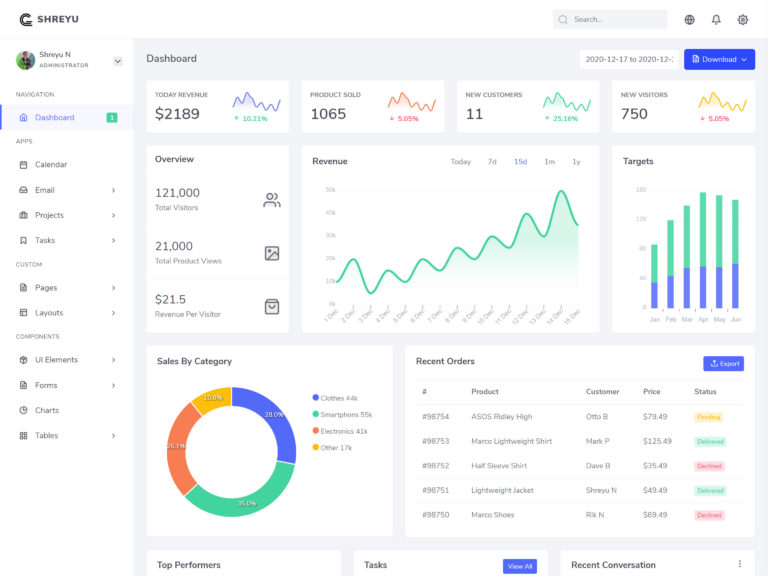 プレミアムLaravel管理テンプレートから期待できるように、Shreyuには、電子メール、タスクマネージャー、プロジェクト管理ツールなどの便利なアプリが付属しています。 すべてのアプリは、Shreyuテンプレートのモダンで最小限のデザインを共有しており、ダッシュボードの他の部分とシームレスに統合するのに役立ちます。