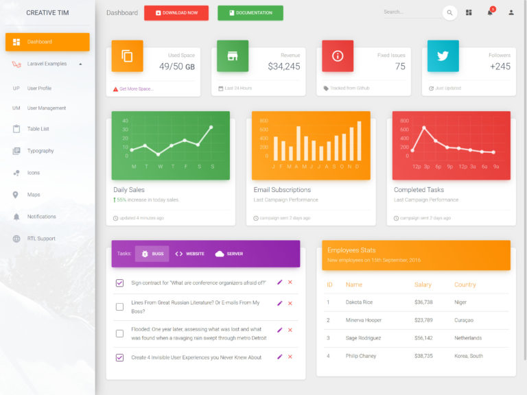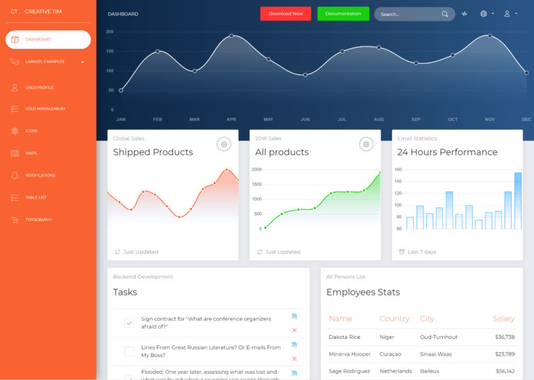 Now UI Dashboard Laravelのデモをチェックアウトすると、ログインして、ユーザーがログインしたときに表示される内容を直接体験できます。これにより、Now UI Dashboard Laravelのさまざまな要素とコンポーネントを調べて、その方法を確認できます。グラフや通知などの機能が機能します。
