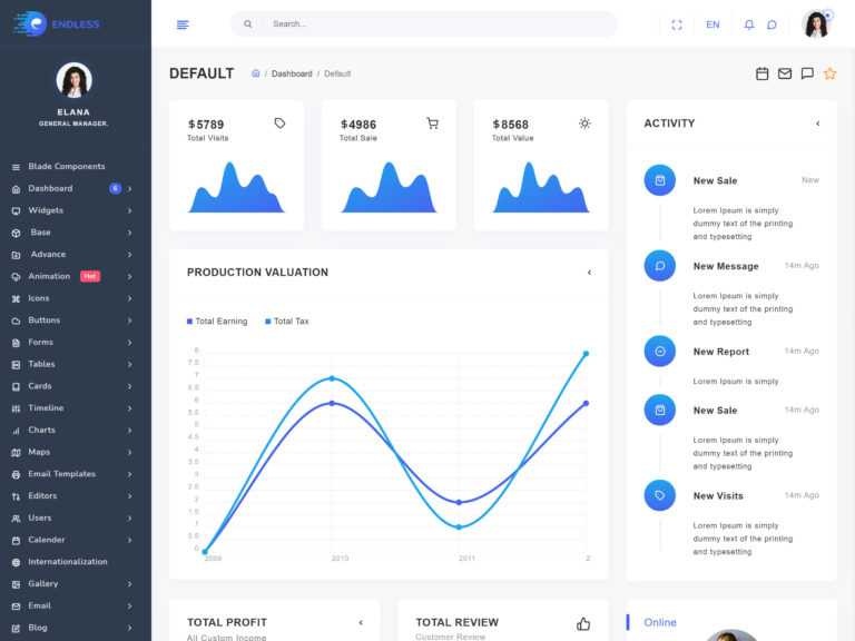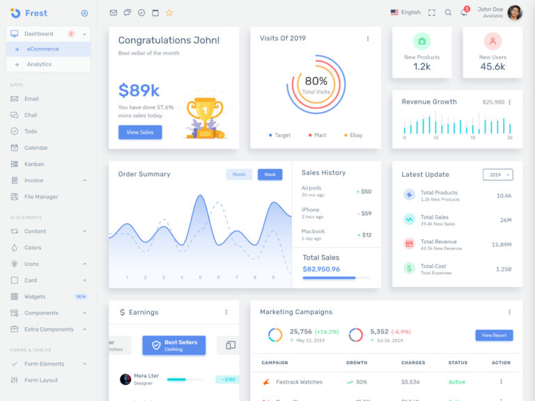 Frestを選択した場合に管理領域に含めることができる機能に関しては、利用可能な便利なアプリがたくさんあります。 チャット、メール、カレンダーはアプリ選択のほんの一例であり、ダッシュボードにToDoリストツールやファイル管理システムを追加できるものもあります。 利用可能な要素もたくさんあります。 これらは、テキストやアイコンの表示などの基本的なオプションから、カルーセルやグラフなどの高度な例にまで及びます。 Frest機能リストを調べて、このLaravel管理テンプレートパッケージに必要なものがすべて揃っているかどうかを確認する価値があります。