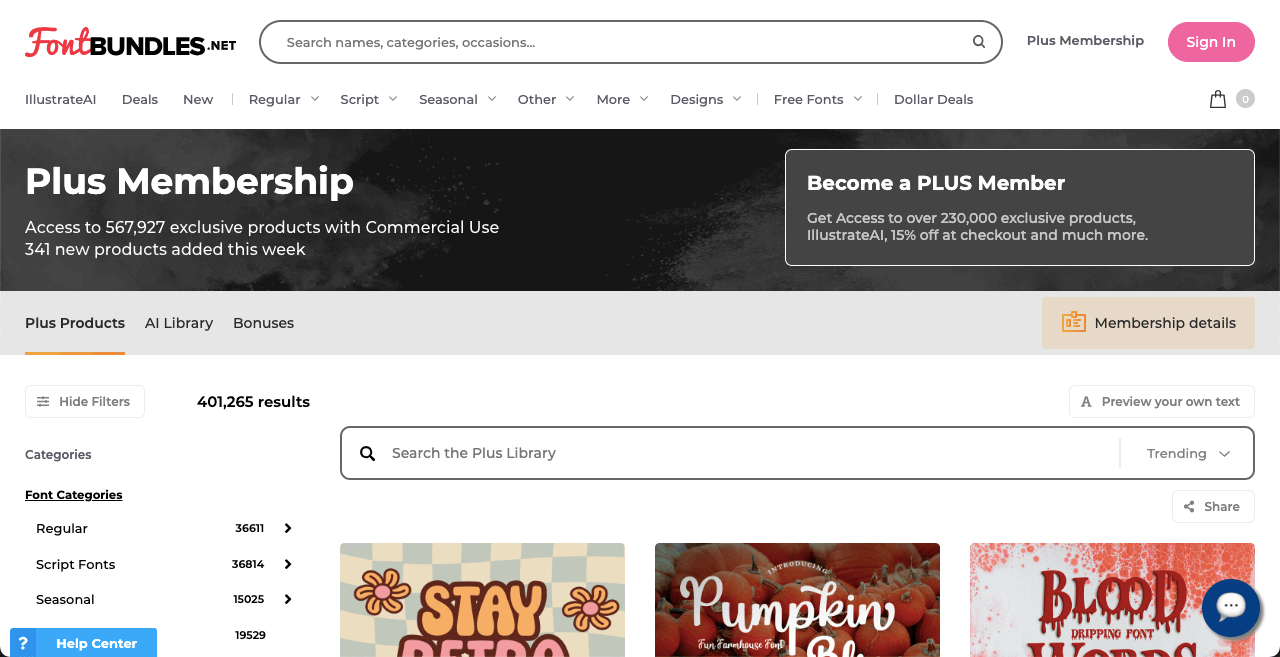 Font Bundles は、無料フォントとプレミアム フォントの両方を見つけるためのもう 1 つのよく知られたプラットフォームです。 Web サイトでアカウントを作成すると、フリー フォントをフィルタリングして除外できます。 ニュースレターにサインアップして、新しいフリー フォントが Web サイトに追加されたときにすぐに通知を受け取ることもできます。