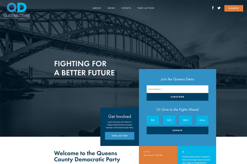 ほとんどのブランドはビジネスを成長させるためにWebプレゼンスを信頼していますが、非営利組織もそれを考慮する必要があります。 これは、政党、社会運動、政治関連のWebサイトで検討すべき優れたオンラインソリューションです。 登録された民主党員、草の根活動家、コミュニティベースの民主党クラブ、選出された役人の多様な連合であるクイーンズデムズをチェックしてください。 関連するWebコンポーネントが追加されたプロ並みのホームページがあります。 ヒーローシーンには、その後のセクションと重なる魅力的なCTAが付属しています。 さらに、最新のニュースセクションも例外的に見えます。