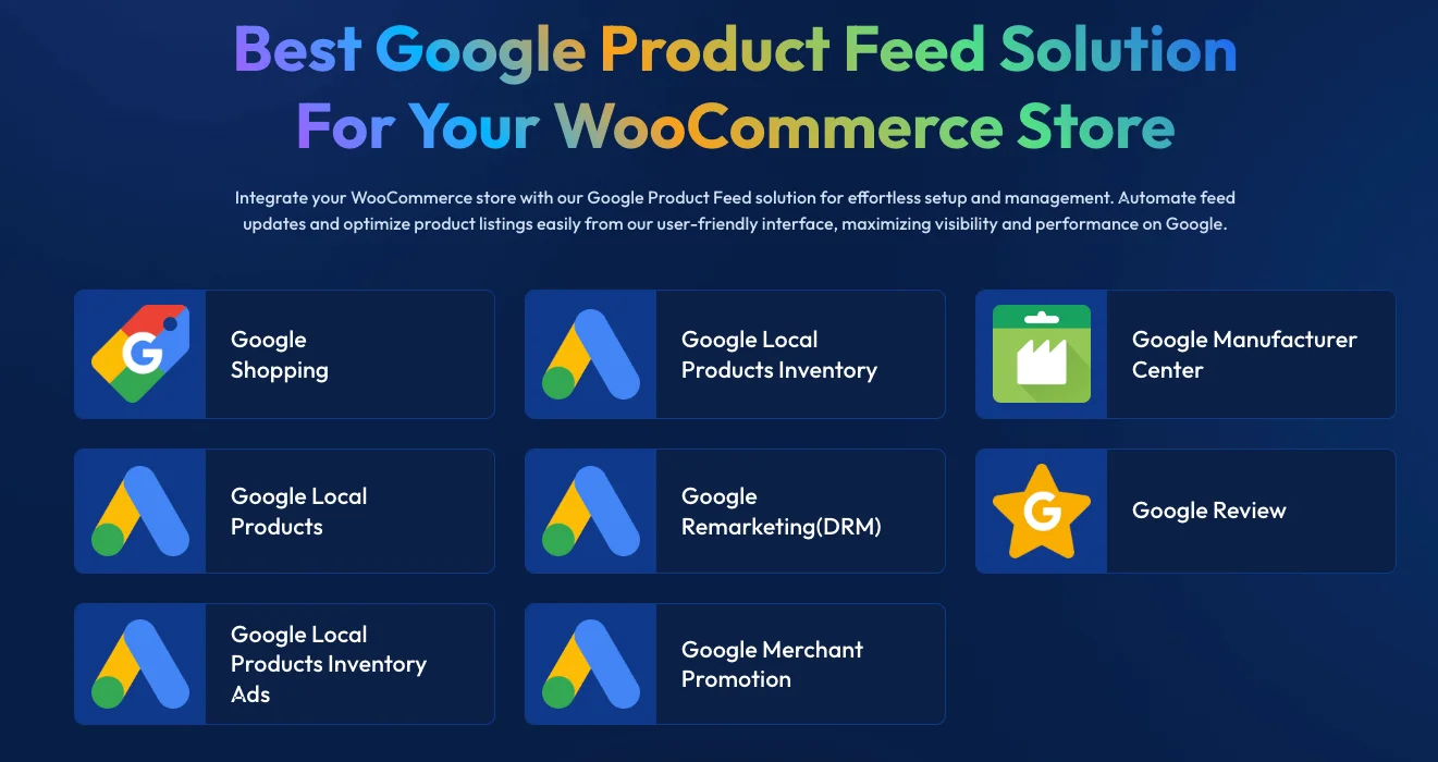 Google ショッピング、Bing、Amazon、eBay、その他の人気のある Web サイトなどの主要なプラットフォームの商品フィードの作成と最適化のプロセスを簡素化するさまざまなプラグインが利用可能です。