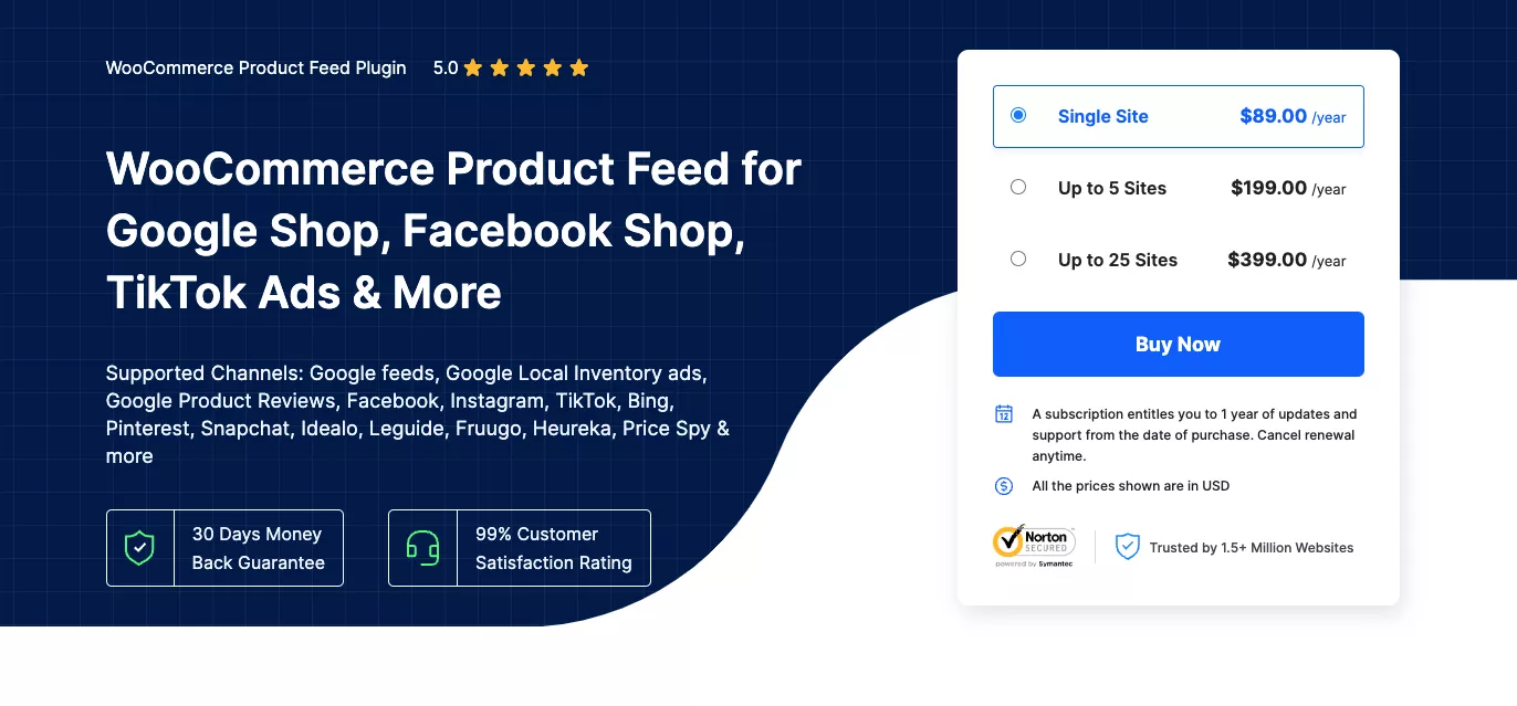 Product Feed By Web Tofee では、必要なサイトの数に基づいて 3 つの料金プランを提供しています。単一サイトの場合、このプラグインの料金は年間 89.00 ドルです。