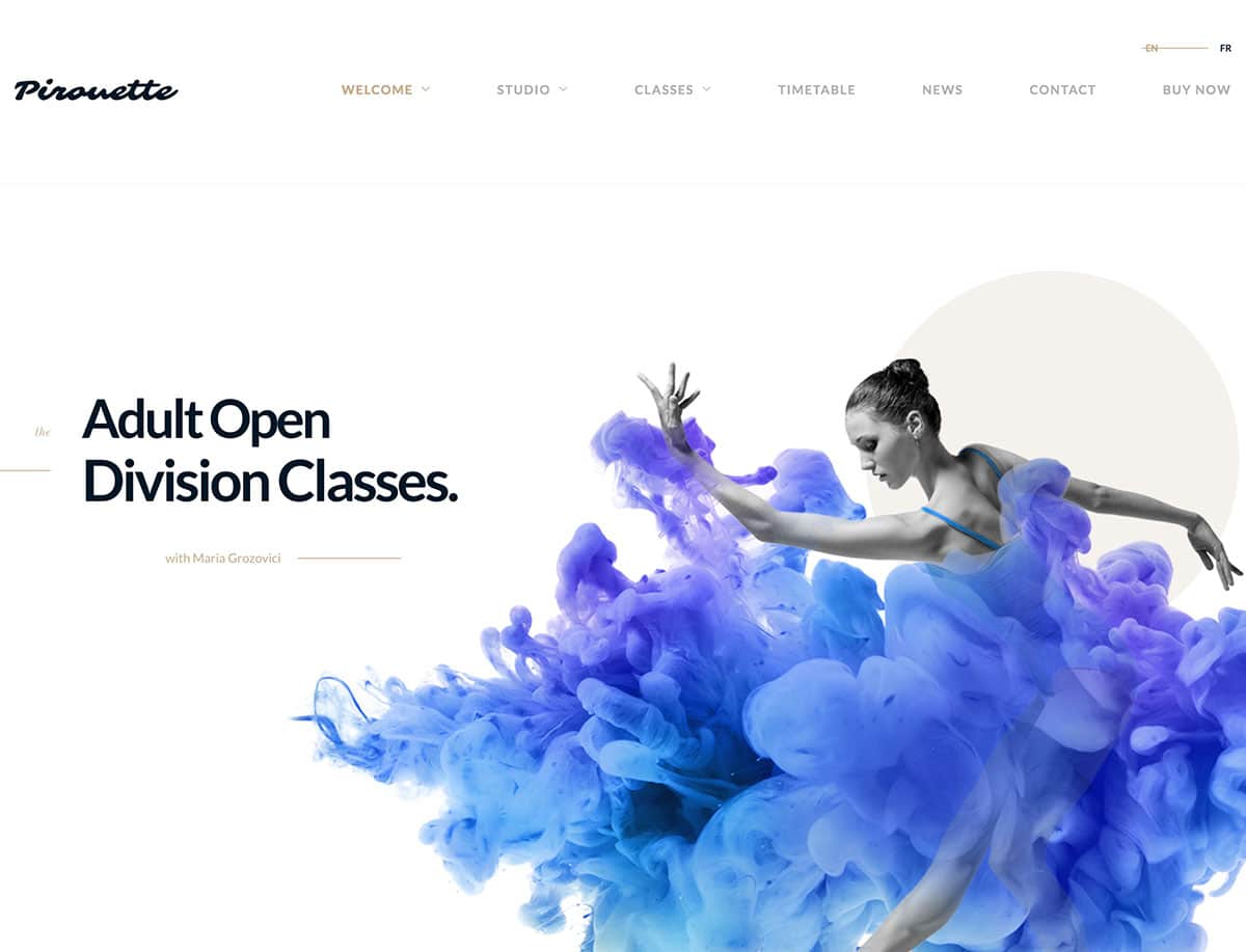 さまざまなピルエットのデモにより、このテーマは、ダンススタジオのWebサイトを作成したり、ダンススクールや提供されているクラスを宣伝するサイトを構築したりするのに適しています。 スタジオの設備を強調して、そのようなスペースを雇いたい人やダンスクラスのビジネスを経営している人に知らせたい場合は、ピルエットをよく見る価値があります。