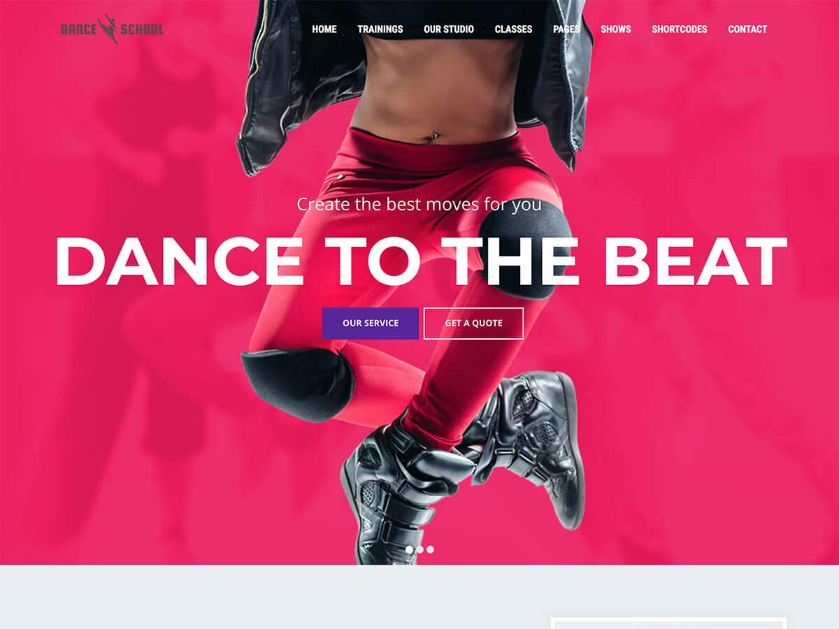 スタイリッシュな色の選択と興味深いレイアウトモードを含む完全にモダンなデザインのダンススクールは、訪問者の注意を引くダンススタジオのWebサイトを作成したい人に適したオプションです。 あなたのダンススクールの焦点がより現代的な動きの形にあるなら、このテーマはチェックする価値があります。