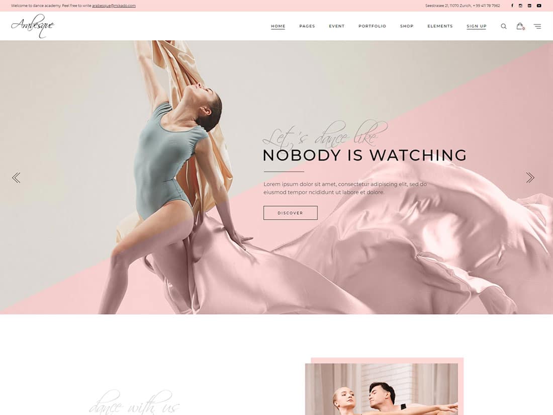 ホームページ、アバウト、連絡先ページのデザインなど、最新のWordPressテーマにあると思われる標準のテンプレートに加えて、Arabesqueには他にも便利なビルド済みコンテンツがいくつかあります。 したがって、イベントの詳細をWebサイト、ダンススクールやスタジオの時刻表、またはダンススタジオの商品や機器を販売するオンラインストアセクションで公開する場合、Arabesqueにはすぐに使用できるテンプレートがあります。