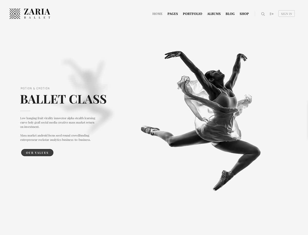 これは比較的新しいWordPressテーマであるため、Fitness Clubとそのダンスに焦点を当てたデモを選択すると、サイトの最先端のデザインが得られます。 このデモはバレエスクール向けに設定されていますが、サンプルのテキストと画像を簡単に編集して、生徒に提供しているダンスのスタイルに合わせることができます。 ホームページのレイアウトには、ビジネスを宣伝するために必要なすべての要素に加えて、サイトの視覚的な魅力を高めるいくつかのアイテムが含まれています。