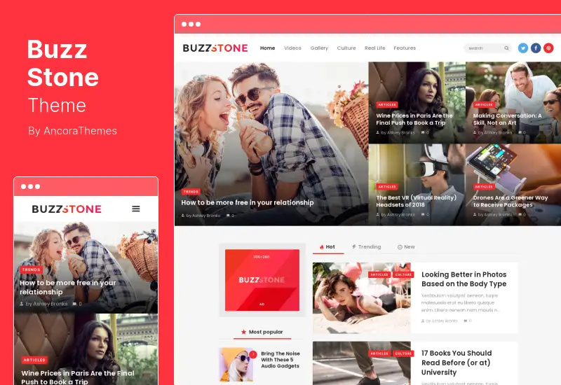 Buzz Stone は、カラフルで洗練された魅力的でトレンディな WordPress ブログ テーマで、クラッシュ テスト ダミー、ゲスト投稿、ルージュ、ギバー、景品、ガイド、ハウツー ブログなどのニッチなブログに適しています。 雑誌やバイラルブログのWordPressテーマとして使用できます。