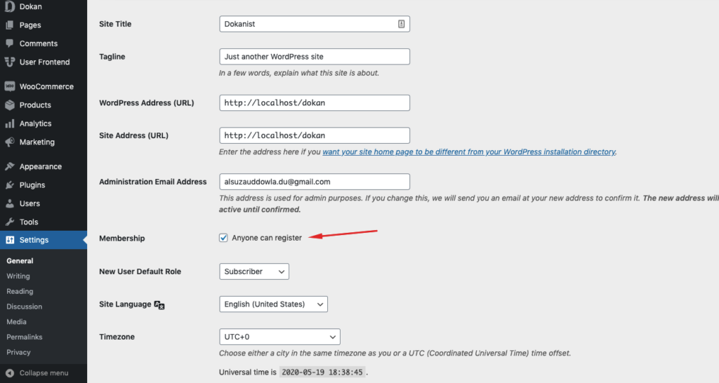 次に、ベンダーと顧客がサイトに登録できるように、誰でも登録できるようにします。 これは、 WP管理ダッシュボード>[設定]>[一般]>[オンにする]から実行できます。誰でも登録できます。