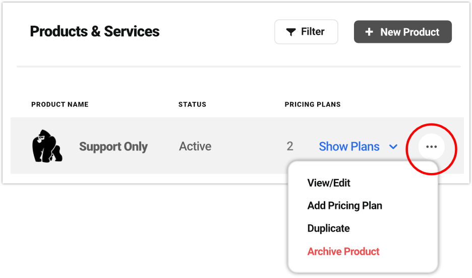 任意の製品のオプションを管理するには、省略記号アイコンをクリックし、ドロップダウン メニューから任意のオプションを選択します: [表示/編集] 、 [料金プランの追加] 、 [プランの複製] 、または [製品のアーカイブ] 。