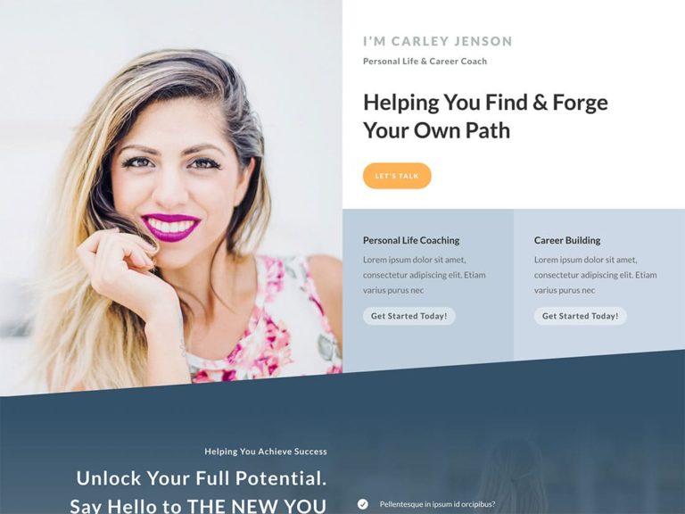 コーチングWebサイトのフロントページ用に選択できる2つの主要なホームページレイアウトには、訪問者とつながり、ターゲットオーディエンスにサービスを効果的に宣伝するのに役立つ多くの機能が含まれています。 いくつかの例には、全幅の写真、ウェルカムメッセージ、および召喚ボタンを表示するために使用できる大きなヘッダーセクションが含まれます。 クールなホームページ要素には、紹介された場所、受賞した賞、または一緒に仕事をしたクライアントのロゴを表示するためのパネルや、訪問者にテキストで自己紹介できる要素が含まれます。と写真。